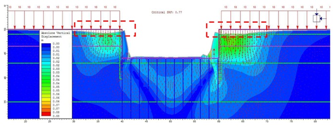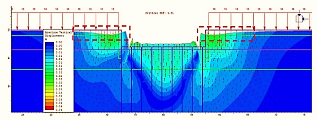 La sobrecarga equivalente en el fondo de las excavaciones (qsf) se estimó en 10 kPa, de manera conservativa. La profundidad del empotramiento de las pantallas para garantizar la estabilidad del sistema se estableció en 1.5 H, en donde H es la sumatoria de las alturas de los sótanos, o profundidad total de excavación. Las fronteras de los modelos de simulación se extendieron hasta 50 m de profundidad y longitudes iguales al ancho de base (B) a partir de los paramentos de las pantallas. Se incluyeron sobrecargas en superficie de 10 kPa y 20 kPa uniformemente distribuidas, que representan de manera simplificada la presencia de estructuras y elementos aledaños propios del entorno urbano.
