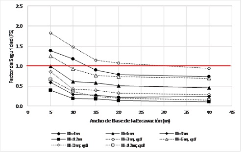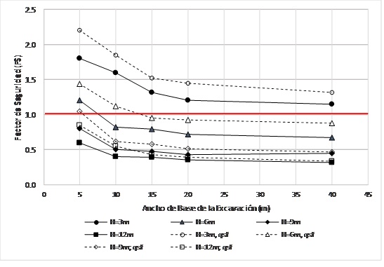 En las Figuras 6 y 7, se presentan los resultados de los factores de seguridad determinísticos contra falla de fondo establecidos para las excavaciones analizadas con sobrecarga en superficie de 10 kPa, y de 20 kPa, respectivamente. En las gráficas, también se presentan los resultados de los factores de seguridad estimados con y sin sobrecarga en el fondo de la excavación (qsf) de 10 kPa, la cual se relaciona con el efecto combinado de la carga equivalente que absorben los pilotes incluidos en el análisis paramétrico. En las mismas figuras, se presenta el valor límite del factor de seguridad de 1. Los resultados muestran que las excavaciones con anchos de base entre 5 m y 40 m y profundidades de 3 m con y sin sobrecarga en el fondo, para los dos escenarios analizados de sobrecarga en superficie, presentan factores de seguridad superiores a 1 y algunas excavaciones de 5 m y 10 m de ancho y 6 m de profundidad pueden considerarse seguras, principalmente por el efecto de la sobrecarga en el fondo de la excavación. Los resultados sugieren que el efecto de la sobrecarga en el fondo contribuye con un aumento del factor de seguridad entre el 18 y el 23% para todos aquellos casos en los cuales este factor es superior a 1.