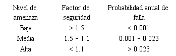 Para determinar el nivel de amenaza para los estados ELU, se siguieron los procedimientos reportados en [12, 13, 14, 15, 16, 17, 20]. En la Tabla 4 se presentan intervalos de valores que definen los escenarios de amenaza baja, media y alta para los estados ELU y la probabilidad de falla.