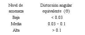 Para la estimación de los escenarios de amenaza por desplazamientos verticales en superficie, se empleó una categorización aproximada de los daños probables de elementos en superficie debidos a la magnitud de los giros asociados a la distorsión angular equivalente (ϴ). En este sentido, luego de la revisión de diversas propuestas de autores como [14, 16, 17, 18, 19, 20], y en contraste con la propuesta de [2], en la Tabla 5 se presentan los umbrales que definen el daño probable en los estados límite de servicio (ELS) de estructuras y otros elementos del entorno urbano en superficie, a partir de los valores de la distorsión angular equivalente (ϴ).