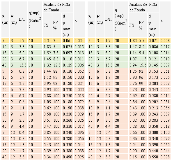 En la Tabla 7 se visualizan los datos obtenidos junto con la clasificación por color de acuerdo con la matriz de amenaza planteada, obteniendo que para profundidades hasta 3 m con cargas de 10 kN/m2 y 20 kN/m2, la probabilidad de ocurrencia de falla es baja, excepto para el caso de la excavación de 5 m x 3 m, la cual presenta una amenaza moderada. Finalmente, para excavaciones a 6 m, 9 m y 12 m con ambas cargas en superficie, la amenaza es alta; siendo congruente con la realidad de las condiciones de respuesta mecánica de los suelos del norte y del noroccidente de la ciudad durante la ejecución de excavaciones.