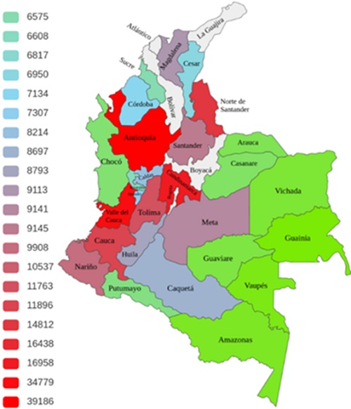 Liberales y conservadores (los dos partidos políticos dominantes de la época) empezaron una lucha frontal que dejó cerca de 300.000 muertos, lo que ocasionó el desplazamiento interno de millones de personas a las grandes ciudades del país [13]. Esta etapa marcó también el inicio de las guerrillas en el país y puso de manifiesto las más tremendas formas de violación de los Derechos Humanos. Los asesinatos de líderes también fueron recurrentes en varios departamentos a nivel nacional. Por otra parte, las organizaciones al margen de la ley, o crimen organizado, han potencializado la violencia en las zonas urbanas, lo que ha generado homicidios sistemáticos de personas involucradas y no involucradas con este tipo de organizaciones [14]. En este sentido, el conflicto armado y las organizaciones delictivas han generado muerte por todo el territorio nacional, tal como se demuestra en la Figura 1; se destacan algunos departamentos como Antioquia, donde es posible apreciar que de 1940 a 2019 han ocurrido 39.186 homicidios, de la misma forma, en el Valle del Cauca han ocurrido 34.779 muertes violentas. Como se puede observar en la Figura 1, en la mayoría de los departamentos del eje central de Colombia las cifras también son alarmantes [15].