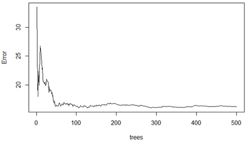 Una vez filtrado el dataset, se definieron los híper parámetros del modelo para que fuera afinado, tal como se muestra en la Figura 2. Los valores de híper parámetros que mejores resultados arrojaron fueron los de número de árboles. Como se puede notar, se ejecutó el modelo hasta con 500 árboles, donde 110 es el número de árboles que mejores resultados obtiene, ya que minimiza el error a 0,67. Por otra parte, el número de variables aleatorias tomadas es 6, las cuales fueron creadas en el análisis exploratorio de datos. El número de muestras sobre las cuales se entrenó el modelo fue el 70% de los registros del dataset. El mínimo número de muestras dentro de los nodos terminales fue 10 y el máximo 5. Estos parámetros permiten evidenciar que, a partir de los 200 árboles, el modelo inicia a estabilizar el valor del error, y el tiempo de ejecución aumenta.