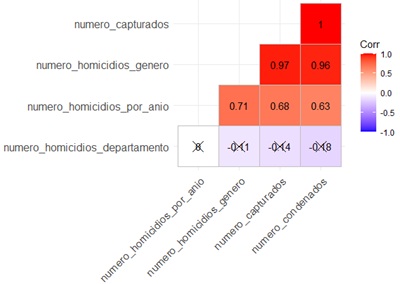 Una vez filtrado el dataset, se identificaron a través de análisis de correlación de Pearson las variables que tienen mejor correlación para trabajar. Como se puede observar en la Figura 3, las variables numero_capturados con numero_condenados tienen una correlación del 100% que permite identificar una relación estadística fuerte y directa. Por otra parte, se puede observar que la correlación de las variables numero_capturados con numero-homicidios-por-anio es de 0.68, es decir 68%, mientras que la correlación de numero_condenados con numero_homicidios_genero es del 96%. Estos números significan que la correlación es positiva, es decir, que las variables se correlacionan directamente.