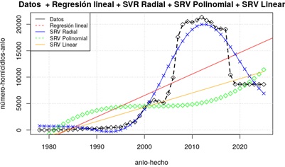 Una vez analizadas las relaciones entre las variables, como primera instancia, se evaluó el modelo propuesto frente a tres modelos del estado del arte, estos fueron: Regresión lineal con máquinas de vectores soporte (SVR), Regresión lineal normal y Regresión lineal con K venecianos más cercanos (KNN). Para todos los modelos se realizó la predicción a 5 años, es decir, se intentó establecer cómo sería la tendencia de los homicidios hasta el año 2025 en la variable numero_homicidios_anio frente a anio_hecho. Para que la evaluación tuviera mayor coherencia, con el modelo de SRV se evaluaron las funciones kernel, las cuales permiten convertir lo que sería un problema de regresión no lineal en el espacio dimensional original, a un sencillo problema de regresión lineal en un espacio dimensional mayor. Las funciones evaluadas fueron radial, polinomial y lineal. La Figura 4 permite observar que el modelo de SRV implementando la función kernel radial (línea azul) obtiene los mejores resultados, es decir, que las predicciones en la regresión se parecen más a los datos (línea negra) o guardan más cercanía. Por lo anterior, el modelo de SRV con la función radial fue tomada para la comparación de resultados frente el modelo propuesto.
