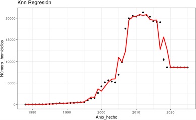 Una vez seleccionado el modelo de SRV, se realizó el proceso de predicción con el modelo de KNN, la Figura 5 muestra que el modelo tiene buena predicción (línea roja), ya que guarda cercanía o similitud con los datos (puntos negros). En la predicción se puede observar que solo unos datos se dispersaron entre los años 2017 y 2020, debido a que entre los años 2019 y 2020, se predice un valor mucho más elevado que los datos originales.