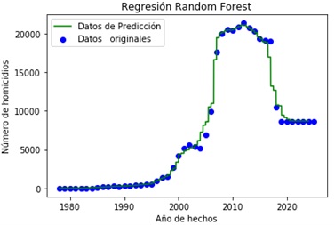 Posteriormente, se evaluó el modelo propuesto, en la Figura 6 se puede observar que el modelo predice de manera armónica los valores de la variable dependiente (numero_homicidios), ya que sus valores guardan mayor cercanía y no están muy dispersos en la regresión, esto se debe a que los árboles generados por randomforest minimizan la distancia entre cada punto de la variable dependiente y los valores logrados en el índice Gini o entropía, en este caso, los valores de la variable hechos-anio. El modelo predice que el punto más alto es en el año 2012, con un valor promedio de 21.342 homicidios, pero a medida que aumenta el valor de la variable independiente, los valores de la variable dependiente tienden a bajar, prediciendo así que para el año 2025 el número de homicidios disminuirá en Colombia; de la misma manera, para el 2021 disminuirá a 8.649 homicidios, y para el 2025 disminuirá a 843 homicidios. Esto se puede predecir ya que actores como el Estado, la Policía Nacional y la Fiscalía General de la Nación han implementado programas de convivencia, los cuales están acompañados de herramientas tecnológicas como las cámaras de video vigilancia, además, el acuerdo de paz con la guerrilla de las FARC hace que el conflicto armado disminuya sin confrontación, hecho que disminuye notablemente los homicidios en Colombia.
