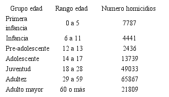 La violencia en Colombia no distingue edad o condición social, la Tabla 1 muestra las cifras de personas asesinadas entre 1965 y 2019 [16]. En estos datos se aprecia que los adultos entre 29 y 59 años son las personas que con mayor frecuencia son asesinadas, debido a que muchos son actores activos del conflicto armado, perteneciendo a grupos de guerrilla o paramilitares que actúan en sectores rurales. Además, están las personas que pertenecen a bandas de crimen organizado enfocados en negocios ilícitos, como el narcotráfico, que operan en el sector urbano de las grandes ciudades [6, 7, 8, 9, 10, 11, 12, 13, 14, 15, 16, 17]. Por otra parte, la población entre 18 y 28 años representa una de las cifras más altas en cuanto a homicidios, debido a que en este rango de edad algunos jóvenes ingresan a pandillas o bandas de crimen organizado por falta de oportunidades laborales. Una cifra que llama la atención es la de primera infancia, entre los 0 y 5 años, homicidios que en su mayoría se relacionan con venganzas entre los actores del conflicto, o con atentados terroristas que impactan en la vida de la población inmersa en problemas de seguridad.
