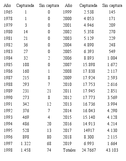 La disminución de los homicidios en los últimos años tiene relación con el aumento en el número de capturas. La Tabla 2 muestra el número de capturas por año, donde se observa que es mayor el número de los no capturados. Por ejemplo, de los 233.957 homicidios ocurridos entre 1965 y 2019, en el 85.17%, es decir 200.345 homicidios, no hay personas capturadas (homicidios en impunidad o sin responsables), mientras que solo el 14.82% (3.3612) de los homicidas fueron capturados.