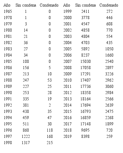 La Tabla 3 muestra los datos de las personas condenadas por los actos de homicidio de 1965 a 2019. Similar a los datos de la Tabla 2, el 87.25% (204.345 homicidios) no tiene condenados, esta cifra es un poco mayor a la cifra de los capturados; esto se debe a que en algunos homicidios se captura al homicida, pero no se puede comprobar su participación en los hechos y queda en libertad, permitiendo en muchos casos que cometa otros homicidios.