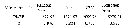 Como se observa en la Tabla 5, los valores más bajos de RMSE los obtiene el modelo propuesto de RF, esto quiere decir que los valores predichos están mucho más cerca de los datos ideales o reales, ya que el error cuadrático medio de la solución es menor. En este sentido, RF ajustado obtuvo mejores valores que distan en 679.53 frente al modelo de regresión como KNN que logra 1391.97, es decir casi el 100% más; por otra parte, la diferencia de RMSE es bastante alta con relación a SRV y Regresión lineal.