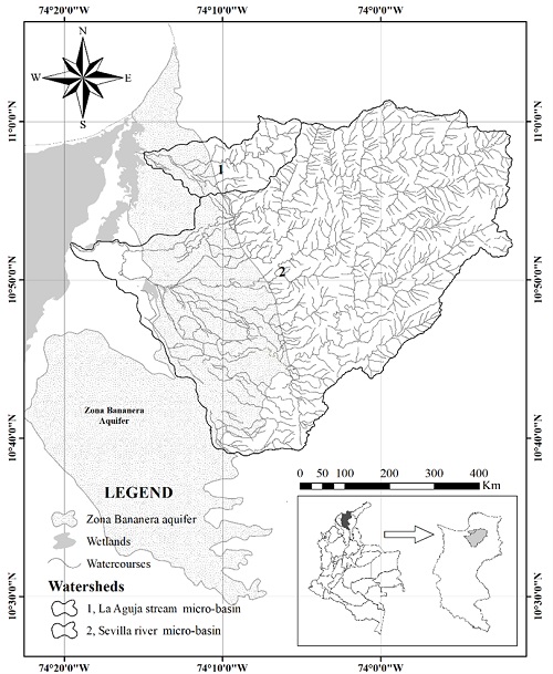 The study area is found in the municipality of Zona Bananera, Magdalena, Northern Colombia; corresponding to the Sevilla River micro-basin with an extension of 1086.5 km2, perimeter of 172.5 km, and a main channel length of 75.5 km; in addition to La Aguja stream micro-basin with an extension of 91.5 km2, a perimeter of 50.6 km, and a main channel length of 27.6 km (Figure 1). The study area shows average annual precipitation of 1112.7 mm with variations between 693.3 and 1532 mm, an average temperature of 28.1°C with a confidence interval between 27.3 and 29°C, and relative humidity between 78% and 83%. Approximately 290.5 km2 of the Sevilla river basin and 32 km2 of La Aguja stream basin intersect with the Zona Bananera aquifer.