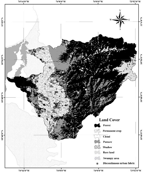 Land cover was determined by digital classification of satellite images using supervised classification for an atmospherically corrected Landsat 8 image, taken on January 22, 2019, and obtained through the United States Geological Survey (USGS) that contains the study area (https://earthexplorer.usgs.gov/), using the Corine Land Cover methodology adapted for Colombia by the Institute of Meteorology and Environmental Studies (IDEAM). The grouping of cover classes was carried out using the maximum likelihood algorithm, which, based on the "training areas" definition, groups the pixels with similar statistical information under the defined category or class. This algorithm is used for classification since it is the one that gives the most statistical validity to the classification [12, 13].