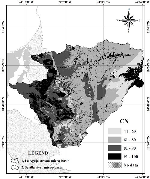 Figure 3 shows the spatial distribution of the CN for the study area. The Sevilla River micro-basin presents CN values lower than 80 in approximately 56.1% of its territory (60,868.7 ha), which makes it the area with the best conditions for the infiltration process; because of the interaction between cover types, management practices, and soil texture. La Aguja stream micro-basin presents CN values between 81 and 90 in 51.2% of the area, infiltration being affected in more than 80%, and CN values greater than 90 in 19.7% of the area; because the zone physical conditions do not favor infiltration, promoting surface runoff.