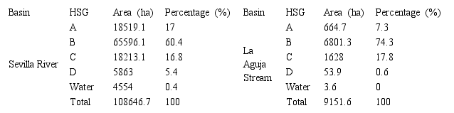 Table 1 shows the hydrologic soil groups (SHG) for the study area. 77.4% (84115.2 ha) of the soils of the Sevilla river micro-basin and 81.6% (7466.1 ha) in La Aguja micro-basin were classified as SHG A or B; indicating that there is a low potential for runoff, as it favors infiltration.