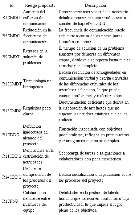 Debido al límite de espacio, la Tabla 4 contiene la descripción para un subconjunto de ellos; así, muestra 9 riesgos con su respectiva descripción y con el identificador también incluido en la Tabla 3, del siguiente modo: la dimensión a la que pertenece —comunicación (CM), coordinación (CD) o cooperación (CP)— y la distancia en la cual se inscribe —distancia geográfica (DG), distancia temporal (DT), distancia sociocultural (DS) o no aplica (NA)—. Las métricas asociadas con estos riesgos se reseñan detalladamente en la siguiente sección.
