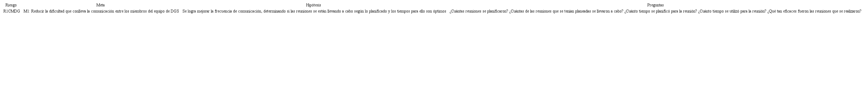 Por lo tanto, los criterios para definir al conjunto de métricas se explican enseguida: (i) específicas, fáciles de entender y de utilizar por parte de las organizaciones de software que trabajan con equipos geográficamente distribuidos, (ii) adaptables a las necesidades de cada organización y (iii) fundamentadas en metodologías reconocidas. Además, se consideraron las características sugeridas para la correcta definición de las métricas de software; es decir: (i) cuantificables, (ii) independientes, (iii) explicables y (iv) precisas. La Tabla 5 muestra las metas, hipótesis y preguntas para el riesgo con identificador R1CMDG incluido en la tabla 4 (los demás riesgos pueden consultarse en https://bit.ly/3lZtKMF).