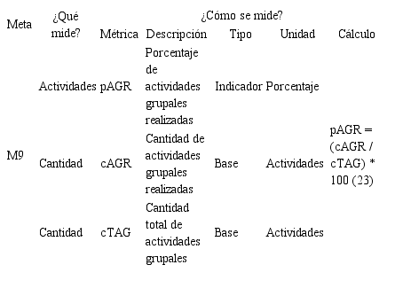 Debido al límite de espacio, la Tabla 6 solo contiene las métricas diseñadas para la meta M9 presentada en la Tabla 5; aquellas vinculadas con las metas M1 a M8 se encuentran en https://bit.ly/327VMO0. Las métricas se organizaron en relación con dos preguntas: ¿qué mide?, donde se establece el atributo por cuantificar, y ¿cómo lo mide?, donde se indica cada métrica a través de estos elementos: descripción, tipo, escala y función de cálculo. El identificador de la meta es el mismo que aparece en la Tabla 5. En https://bit.ly/33dA8XY se presentan ejemplos de uso de las métricas propuestas para cada riesgo, con su correspondiente escala de interpretación.