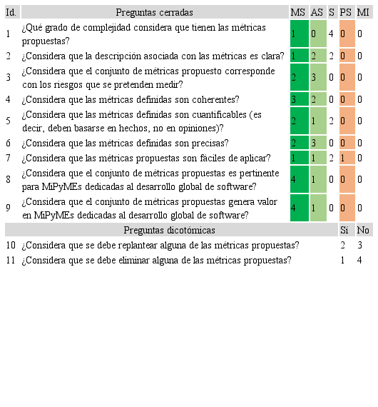 La Tabla 7 refiere que, de manera general, los participantes estuvieron de acuerdo con la mayoría de los riesgos y métricas propuestos. Sin embargo, se tomaron como respuestas poco favorables aquellas calificadas como PS; en este caso, la pregunta 7 se tuvo en cuenta para ejecutar acciones de mejora sobre la propuesta. De igual forma, se consideraron los comentarios y opiniones de los participantes en el mismo sentido.
