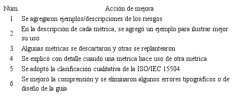 La Tabla 8 resume las acciones de mejora implementadas sobre el conjunto inicial de riesgos y métricas propuestas.