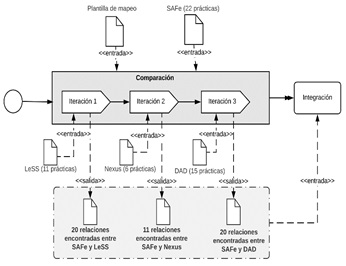 Para llevar a cabo la comparación de los marcos de trabajo, se realizó un análisis de sus estructuras y terminología. Al realizar el análisis de las estructuras de SAFe, LeSS, DAD y Nexus, fue posible encontrar elementos comunes entre ellos, por ejemplo: principios, reglas, prácticas, roles y artefactos. Sin embargo, teniendo en cuenta el alcance definido anteriormente y, dado que elementos como principios y reglas describen el objetivo propio de cada enfoque, la comparación se centró únicamente en las prácticas principales de los marcos y el nivel de detalle de la definición de cada una de ellas. Las correspondencias identificadas fueron constantemente revisadas por la experiencia y criterio de un asesor con amplia experiencia en la definición de modelos híbridos, lo que permitió disminuir el nivel de subjetividad de esta actividad.