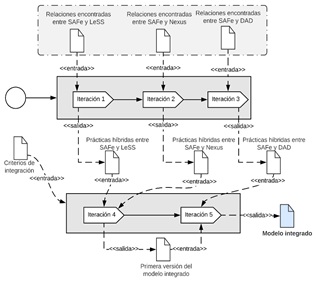 2) Etapa 2. Hibridación entre las integraciones realizadas en la Etapa 1. Luego de las integraciones realizadas en la Etapa 1, se realizaron dos iteraciones más de la siguiente manera: i) se integraron las prácticas híbridas de SAFe y LeSS y las prácticas híbridas de SAFe y Nexus, dando como resultado una primera versión del modelo integrado; ii) posteriormente, estas prácticas se integraron con las prácticas híbridas de SAFe y DAD, obteniendo así un modelo híbrido integrado final. La Tabla 6 presenta un extracto y ejemplo del proceso de integración de las prácticas híbridas de SAFe-LeSS y SAFe-Nexus, donde se evidencia que, si bien la práctica obtenida en SAFe-LeSS (práctica SL) ofrece una definición más detallada que la práctica obtenida en SAFe-Nexus (práctica SN), la definición de la práctica SN complementa la definición de la práctica SL. Por lo tanto, aplica el criterio de integración B (ver Tabla 5) y la definición de la práctica SL se adapta para que contenga la definición de la práctica SN. El resultado de la integración de todas las prácticas híbridas se encuentra disponible en el link: https://bit.ly/3cXwyFj.