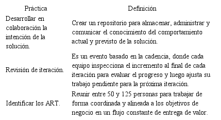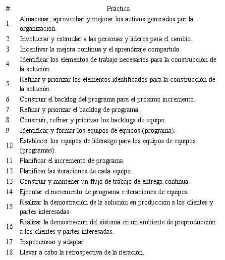 Para llevar a cabo la comparación entre los marcos, se realizó una extracción de la información de aquellas prácticas del desarrollo ágil de software a gran escala definidas por los marcos LeSS, Nexus, DAD y SAFe; identificando 22 prácticas de SAFe, 11 de LeSS, 6 de Nexus y 15 de DAD. En la Tabla 1 se presenta un ejemplo de la extracción de las prácticas de SAFe.