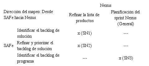 La realización de la comparación tuvo un enfoque iterativo por cada comparación de dos modelos, es decir, un total de tres iteraciones: SAFe y Nexus, SAFe y LeSS, y SAFe y DAD (ver Figura 1). En cada iteración se realizó un análisis semántico y sintáctico con un alto nivel de abstracción que permitiera identificar las características, diferencias y relaciones entre las prácticas comparadas. Finalmente, el revisor analizó los resultados con el objetivo de verificar la fiabilidad de los resultados y el método de comparación. Para organizar las relaciones identificadas en cada comparación, se utilizó una convención, por ejemplo: para la comparación entre SAFe (S) y Nexus (N), se utilizó la etiqueta SNi, donde i es un consecutivo. Este proceso fue aplicado de manera análoga para cada una de las relaciones resultantes de las comparaciones de SAFe (S) vs. LeSS (L) y SAFe (S) vs. DAD (D), que a su vez fueron identificadas con las etiquetas SLi y SDi, respectivamente. En la Tabla 2 se muestra un extracto de la comparación entre las prácticas de SAFe y Nexus. Todas las relaciones identificadas entre la comparación de SAFe y los marcos LeSS, Nexus y DAD están disponibles a través del siguiente link: https://bit.ly/3cXwyFj.