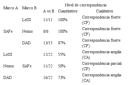 La Tabla 3 presenta las direccionalidades de la comparación, el número de relaciones encontradas, el porcentaje de correspondencia obtenido y su respectiva calificación cualitativa de acuerdo con la escala definida. Como se puede observar, se encontraron 11 relaciones entre SAFe y Nexus, 20 relaciones entre SAFe y LeSS, y 20 relaciones entre SAFe y DAD. Asimismo, se identifica que el nivel de correspondencia de SAFe hacia LeSS, Nexus y DAD es fuerte, con LeSS y Nexus del 100%, es decir, la totalidad de sus prácticas son soportadas por SAFe; mientras que con DAD es del 87%, ya que, de 15 prácticas definidas, 13 se relacionaron con una o más prácticas de SAFe. Por otro lado, en cuanto a los niveles de correspondencia entre DAD, Nexus y LeSS hacía SAFe, se evidenció que tanto LeSS como DAD presentan una correspondencia amplia en relación a SAFe, a diferencia de Nexus, que presentó una correspondencia parcial del 50%. Finalmente, cabe resaltar que, si bien se evidenciaron correspondencias fuertes entre los marcos comparados, esto no significa que sean idénticos, sino que las prácticas identificadas en LeSS, Nexus y/o DAD son equivalentes y han encontrado al menos una relación con una práctica de SAFe.