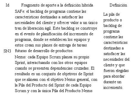 Luego de identificar las relaciones existentes entre los marcos comparados, se realizó un proceso de hibridación de las dos prácticas relacionadas, teniendo en cuenta su nivel de detalle, tomando fragmentos de su definición, y reescribiéndolos como una nueva definición, sin perder el sentido semántico de sus definiciones. Lo anterior, con el fin de establecer una práctica genérica representativa entre las dos prácticas comparadas. De acuerdo con el proceso diseñado, se realizaron tres iteraciones para la hibridación: (i) se hibridaron las relaciones encontradas entre SAFe y LeSS; (ii) se hibridaron las relaciones encontradas entre SAFe y Nexus, y (iii) se hibridaron las relaciones encontradas entre SAFe y DAD. En la Tabla 4, se presenta un ejemplo de la hibridación de la relación SN3 obtenida de la comparación presentada en la Tabla 2. Los resultados de hibridar todas las relaciones encontradas en la comparación de los marcos SAFe, LeSS, Nexus y DAD, se encuentran disponibles en el link: https://bit.ly/3cXwyFj.