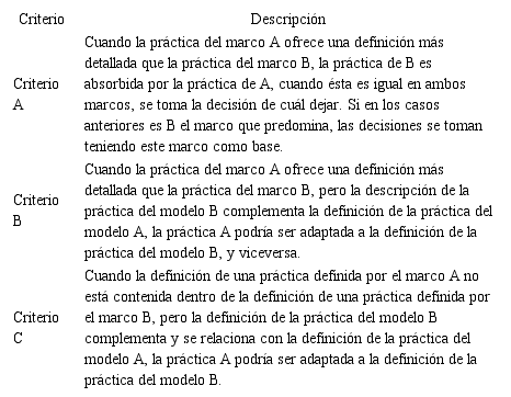 Para facilitar la integración de las definiciones entre las prácticas relacionadas, se estableció un conjunto de criterios de integración basados en los propuestos por Pardo et al [22], los cuales se ajustaron al trabajo, permitiendo saber cómo integrar la definición de cada práctica. El conocimiento previo de los modelos involucrados y la experiencia del revisor fueron fundamentales para aplicar los criterios adecuadamente. En la Tabla 5 se presentan los 3 criterios de integración con su respectiva descripción.