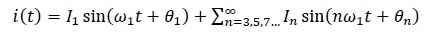 (1)Where the I1 is the magnitude of the fundamental current, Ꞷ1 is the fundamental frequency, and θ1 is the phase angle of the fundamental current. Since the load is connected through an impedance Zs, the demanded current produces a voltage drop. The bus voltage reflects the fundamental and harmonic components of current over the impedance and therefore the voltage at the load node is given by (2).