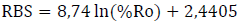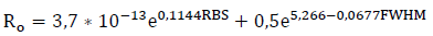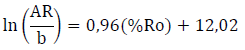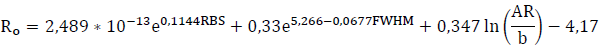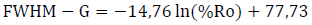 The reflectance of vitrinite (%Ro) was evaluated by fitting the curve of the Raman spectra using the deconvolution method with the second derivative, which allows to find precise information on the adsorption bands. The correlation between the carbon percentage and the Raman characteristic parameters for %Ro were analyzed following the methodology proposed by Zhang and Li [1]. The best correlation terms were used to construct a set of equations coupling the position parameters of the D and G peaks (RBS), G bandwidth (FWHM-G, Full Width at High Maximum for G band), the slope of the fluorescent background (b), and the integrated area of the Raman spectrum (AR), as expressed by Equations (1), (2) and (3), respectively.