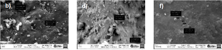 Figure 1 shows the SEM images where the main morphological features of the three coal samples used in this study can be seen. Figures 1(a), Figure 1(c) and Figure 1(e) correspond to images at relatively low magnifications (600X), and Figures 1(b), Figure 1(d) and Figure 1(f) correspond to those at higher magnifications (2,400X and 4600X). The sample of anthracite, Figures 1(a) and (b), exhibited a relatively smooth surface with a pattern of exfoliation or stacked layers, whose laminar texture can be associated with a most ordered carbon structure. This material presents a microporous type structure, with pores in the range between 0.7 µm and 0.8 µm. In general, this sample presents a structure which is denser than that of the remaining samples due to the atomic arrangement shown. The sample of semi-anthracite coal in Figures 1(c) and (d) also presented a layer stacking morphology, with an evidently rough surface, but a less ordered structure than that of anthracite. Pore size measured by SEM in this sample was between 1.3 and 1.5 µm. In the bituminous coal sample, seen in Figures 1(e) and 1(f), a rougher and lumpier surface was observed with no evidence of a layer stacking morphology as in the precedent samples. This is probably due to the low ordering of the atomic structure of carbon and the presence of a higher content of volatile material. Pore sizes in this coal sample were smaller than those of anthracite and semi-anthracite, ranging from 0.2 µm to 0.7 µm. The attempts made in this investigation to identify the macerals were referred to the use of EDS mapping of each sample, which allowed for the determination of chemical composition in specific surface areas of the samples.