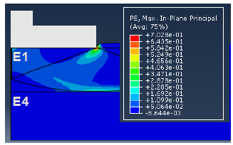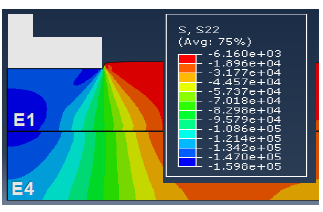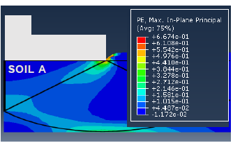 The graphical results obtained from entering the model into the finite element software are shown in Fig. 3. The contour diagram of the plastic deformations (PE) is shown in Fig. 4 and includes a contour diagram of vertical forces. Both Figure 3 and 4 correspond to Soil A, with Df=0 m and e=0.5 m.