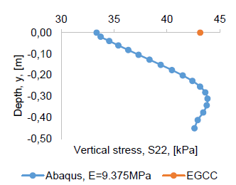 It is important to note that the ideal values of yield stress are taken from the numerical models carried out using one stratum modeled against two strata. The initial condition resulted in the cohesion in soils of one stratum and two strata being null for both cases Df=0m and Df=0.5m. In the case of Df=0.5m and e=0.15m the foundation will be offset in a similar manner. The data from the thickness of the soil layer using analytical methods was not taken into account since it would result in an overload in the numerical modeling.