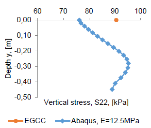 The graphic results of the stratified soil (2 strata) of soil combination 1 Df=0 m and e=0.5 m, are shown as a contour diagram of plastic deformations in Fig. 9 and of vertical forces in Fig. 10.