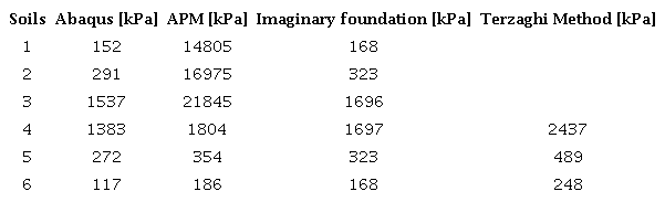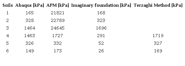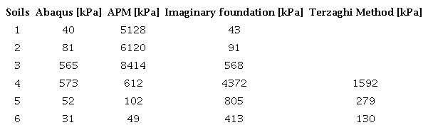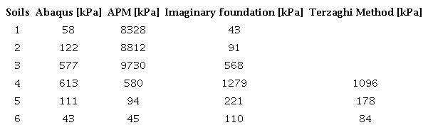 The results of soils 4 and 5 and are about the Imaginary foundation and Terzaghi method are lower than those of Abaqus. This contrasts the results using the APM method in which the Abaqus results are higher as shown in Table 8. Furthermore, for soil 6 all of the results from the analytical methods are greater than the numerical methods.