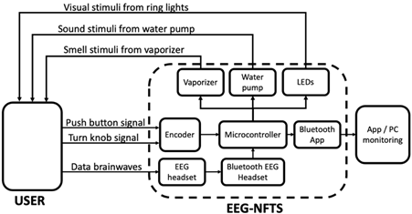 An EEG Neurofeedback Training System (EEG-NFTS) was designed and implemented to measure the brain activity of the participants using EEG Headset Mind Wave Mobile 2 from Neurosky to obtain attention and relaxation levels during meditation sessions. Levels of attention and relaxation were sent to an App to register the information and to evaluate the incidence of each stimulus in the performance of the participants during a meditation session. Figure 1 shows a block diagram of the EEG-NFTS.