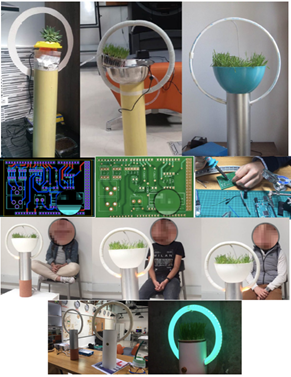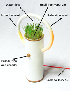 Figure 3 shows the EEG-NFTS interface which is composed of an encoder, a visual light ring indicator, a water flow output and a smell output. The encoder works as a button to turn on/off the system and a knob to set up the time duration of the meditation session (during the test participants were not allowed to set the time duration of the meditation session neither choose which stimuli to activate). The cylinder contains the electronic main circuit board, a water tank and a water pump.