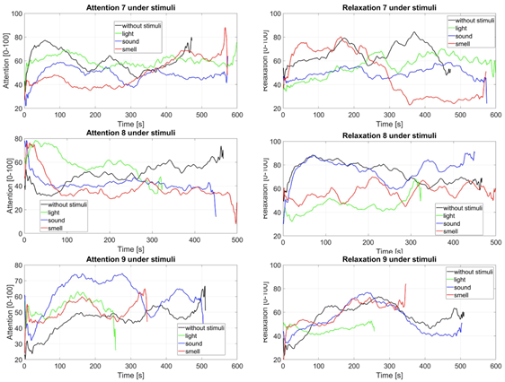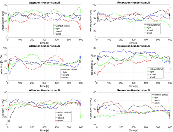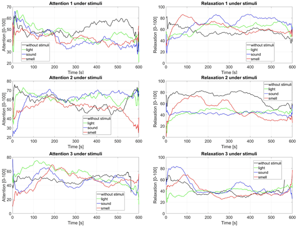 These results show that the visual stimuli feedback was able to increase the average attention levels of 78% of the participants by 11.8% compared to a meditation session without any feedback. The sound stimuli feedback was able to increase the relaxation levels of 44.4% of the participants by 16% compared to a session without any feedback. The visual stimuli feedback has a positive impact on the attention levels but reduces the relaxation levels of the 88.9% of the users by 19.9%. Smell stimuli feedback was only able to increase the average attention and relaxation levels of 33.3% of the participant by 9.9% and 7.3% respectively. The smell stimuli feedback reduced the average attention and relaxation levels of 66.6% of the participants by 16% and 20% respectively.