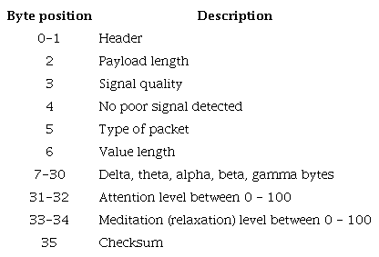 During each meditation session, attention and relaxation levels were collected from each participant by using the EEG Headset Mind Wave 2 from Neurosky which has a Bluetooth that was connected to receive the data packet frame which contains a 12 bit raw brainwaves (alpha, beta, theta, gamma, delta) with a sampling rate at 512Hz and an integrated data meter for attention and relaxation. The levels of attention and relaxation are given directly from the EEG headset in a scale from 0 to 100 and can be obtained by reading bytes 31-34 from the data frame. The data packet frame is described in table 1.