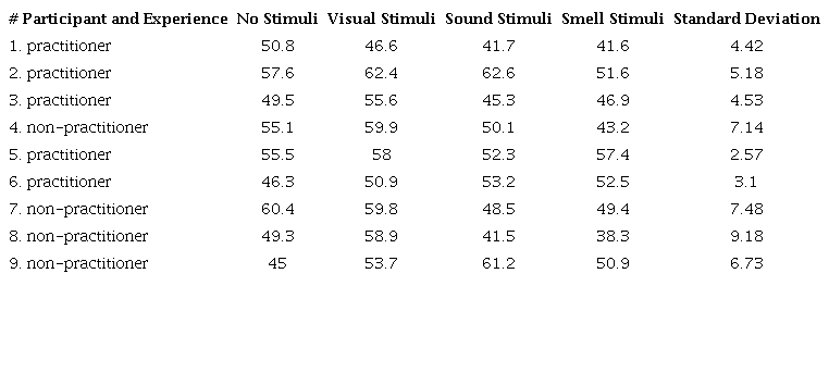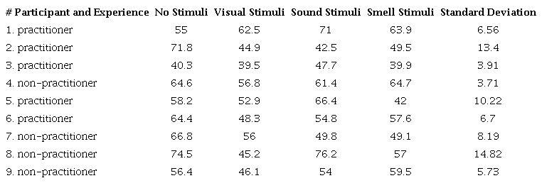 Participants that are practitioners obtained lower levels of standard deviation for attention compared to participants who are non-practitioners. This means that non-practitioners are more sensitive to variations of their attention levels during a meditation session while receiving different stimuli feedback. Standard deviation levels for relaxation were similar for both practitioners and non-practitioners. This means that all the participants are more sensitive to variations of their relaxation levels during a meditation session while receiving different stimuli feedback.
