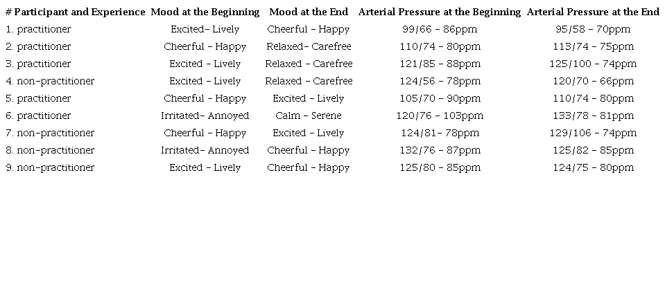 Following the self-reported mood, one can deduce that at the beginning of the test most participants felt excited-lively. At the end of the test, most participants felt cheerful-happy and relaxed-carefree. This resonates with the biometric measurements taken at the beginning and at the end of the test in which most participants show a decrease in both, pulse variability and arterial pressure, this behavior is directly related to low anxiety and high wellbeing. These results show that different stimuli feedback can improve the meditation performance of the practitioners by increasing attention and relaxation levels leading to a desired mindful state.