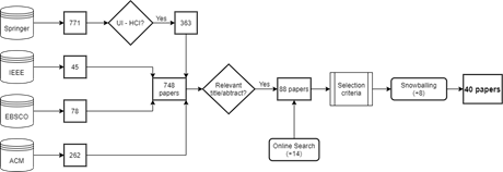 Figure 1 shows the process carried out in the selection of papers. A total of 1,156 results were obtained, excluding duplicated papers. The Springer search was refined for each equation considering the subdiscipline "User interfaces and Human-Computer Interaction", excluding 408 results and limiting the total to 363.