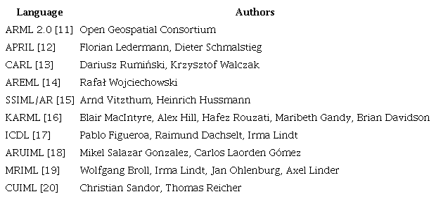 [7] A. Visser, “Survey of XML Languages for Augmented Reality Content,” in Proceedings Augmented Reality Standard Forum, 2010, pp. 1-7.