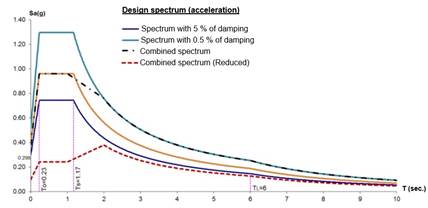 This type of analysis allows the application of the corresponding response reduction factor associated with each branch in the same spectrum. Thus, Figure 1 shows the combined spectrum (black dashed lines) obtained from spectra with different damping values. Finally, in red color and with dashed lines, a combined and reduced spectrum is shown with its corresponding response factor, which is used to model seismic actions.