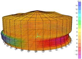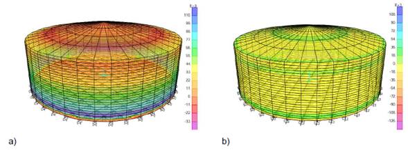 Because of its importance in the research, Figure 4 shows the distribution of stresses that occur in the tank walls, which are responsible for the different failure modes of the tanks under seismic actions.