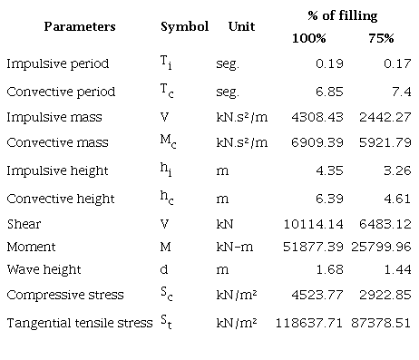 The analysis of liquid storage tanks subjected to seismic action requires specific consideration of the hydrodynamic forces exerted by the fluid on the tank wall, since it has been shown that the dynamic response of this type of structure is affected by the interaction between the fluid and the structure, and therefore, such interaction must be considered in the design of the tanks. According to tests carried out by Graham and Rodriguez [4], it was proved that the oscillating fluid inside the tank has two components, one that moves in unison with the tank (impulsive component) and another one that represents the wave motion on the surface (convective component); based on these studies, Housner [5] - [7] proposed the first simplified models for the calculation of the dynamic response of tanks.