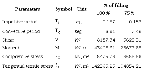 The study presents the dynamic analysis of a vertical cylindrical steel tank of approximately 12000 m3 of capacity, mechanically anchored to the foundation, and subjected to horizontal seismic excitation taking into account different filling percentages (75 and 100 %). The tank has a diameter of 36 m and a total wall height equal to 11.6 m (H/D<1.33), the walls have an equivalent thickness of 0.016 m, and both the bottom and the roof have a thickness of 0.008 m. The tank material has a modulus of elasticity equal to 1.999E+08 kN/m2, and the stored liquid has a density of 9.71 kN/m3 (Diesel fuel). This tank is located in the province of Santiago de Cuba, the most dangerous seismic zone of Cuba (zone 5), in a soil profile type E.